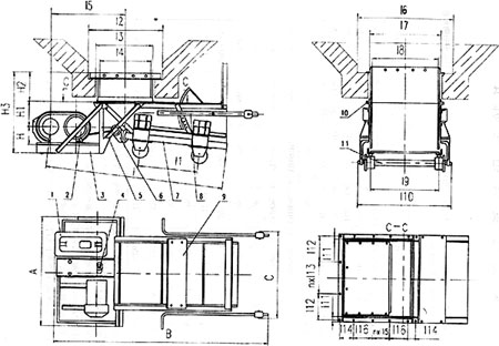 KK型往復(fù)式給煤機(jī)由機(jī)架、底板(給煤槽)、傳動平臺、漏頭號、閘門、托輥組成,當(dāng)電機(jī)開動后經(jīng)彈性聯(lián)軸器、減速機(jī)、曲柄連桿機(jī)構(gòu)拖動傾斜5度的底板在輥上作直線往復(fù)運動,煤均勻地卸到其它設(shè)備上。本機(jī)可根據(jù)需要設(shè)有帶漏斗、不帶漏斗兩種形式。